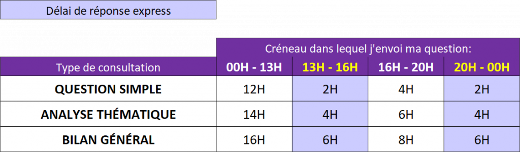 Le tableau ci-dessous indique le délai moyen de traitement de votre question, en fonction du créneau horaire de la journée et du type de consultation choisi. Le service de réponse express est disponible tous les jours entre 13h et 16h, ainsi qu’entre 20h et minuit, pour vous offrir une réponse rapide et prioritaire.